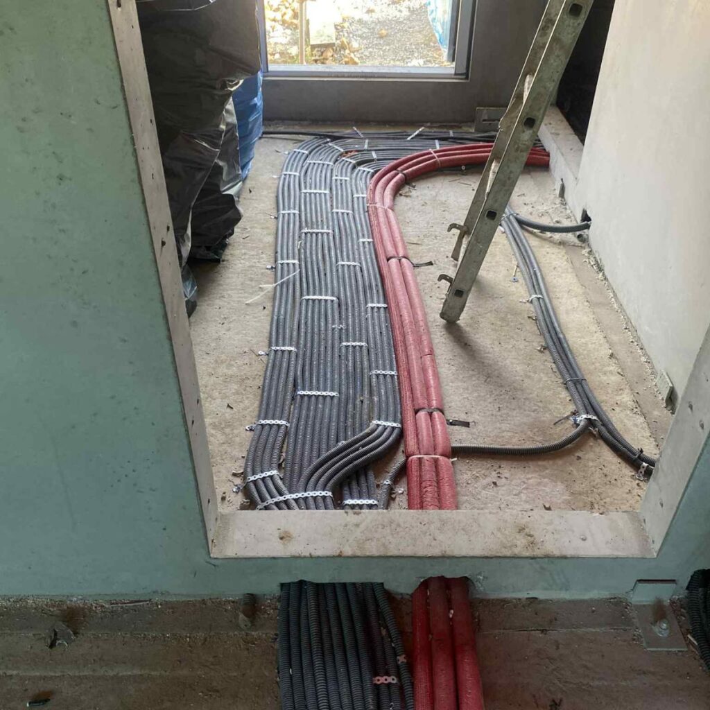 Rozdzielnia główna i podrzędne, przewody w całym domu, gniazdka, włączniki, oświetlenie. Podłączenie AGD (płyta indukcyjna, piekarnik, zmywarka). Instalacja 3-fazowa dla dużych odbiorników (pompa ciepła, ładowarka EV).