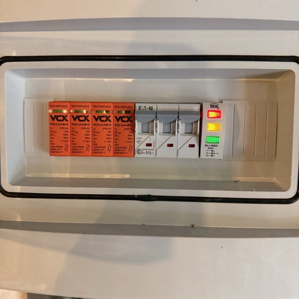 Właścicielka auta elektrycznego potrzebowała dedykowanego punktu ładowania w garażu domu jednorodzinnego w Krakowie. Dotychczasowe ładowanie z gniazdka 230V zajmowało kilkanaście godzin, obciążało standardową instalację i nie dawało pewności bezpieczeństwa przy codziennym użytkowaniu. Zwykłe gniazdko nie jest zaprojektowane pod długotrwałe obciążenie prądem ładowania samochodu elektrycznego — z czasem prowadzi to do przegrzewania przewodów, zadziałania zabezpieczeń i ryzyka uszkodzenia instalacji. Zadanie: poprowadzić dedykowany obwód 3-fazowy od głównej rozdzielnicy do garażu, zbudować osobną rozdzielnicę z pełną ochroną przepięciową i zamontować wallbox Autel MaxiCharger AC Compact 22 kW z możliwością konfiguracji prądu ładowania przez aplikację mobilną.